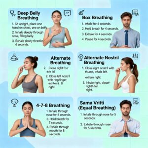 Breathing exercises are nature’s built-in relaxation system. They not only calm the mind but also reduce cortisol levels (the stress hormone), lower blood pressure, and improve overall emotional balance. And the best part? You can do them anywhere — at home, in the office, or even in traffic.